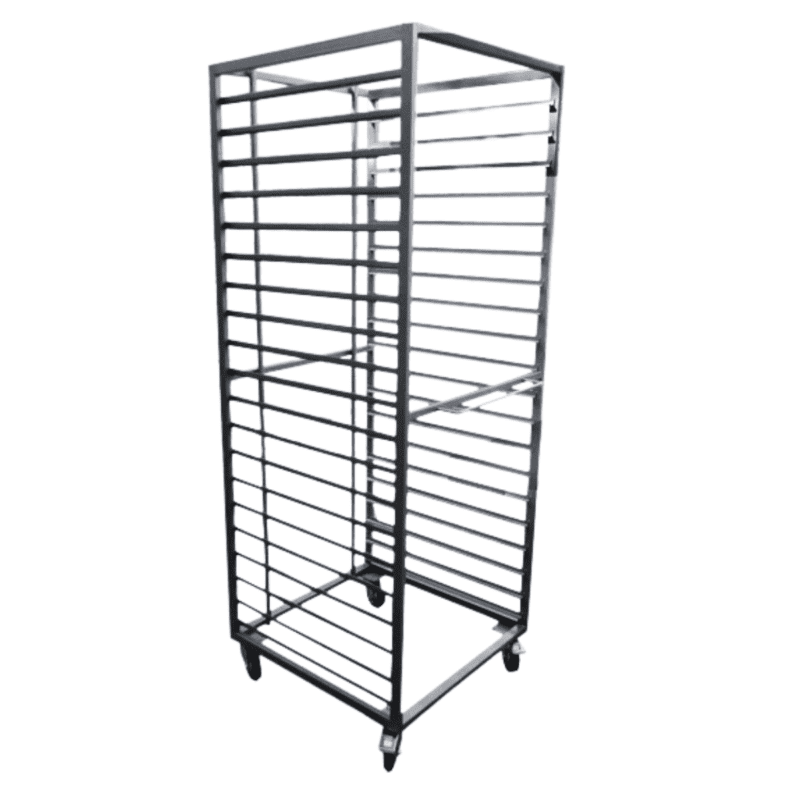 Estructura robusta, ruedas giratorias y diseño funcional para panaderías y cocinas industriales.