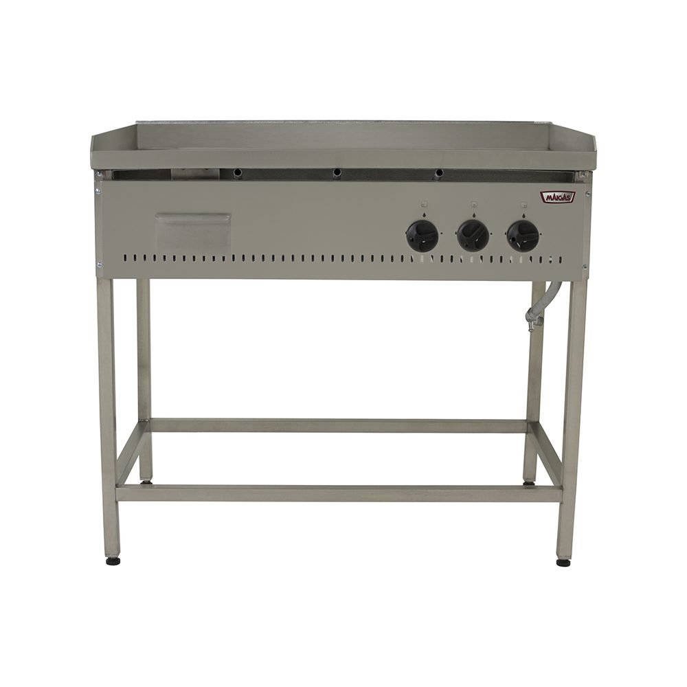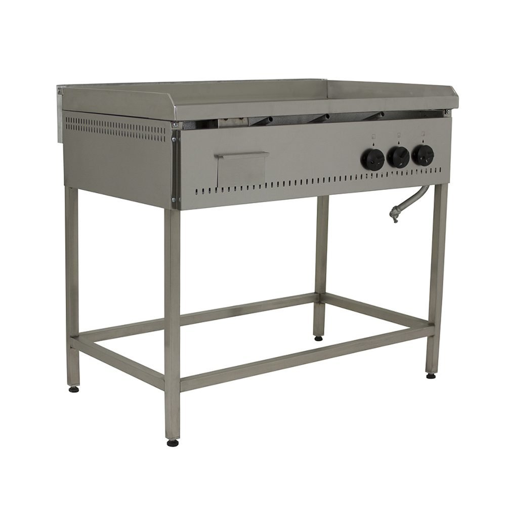 Plancha Churrasquera Lisa 100 cm de acero inoxidable de 6 mm, válvula de gas con seguridad, estructura robusta y consumo eficiente.