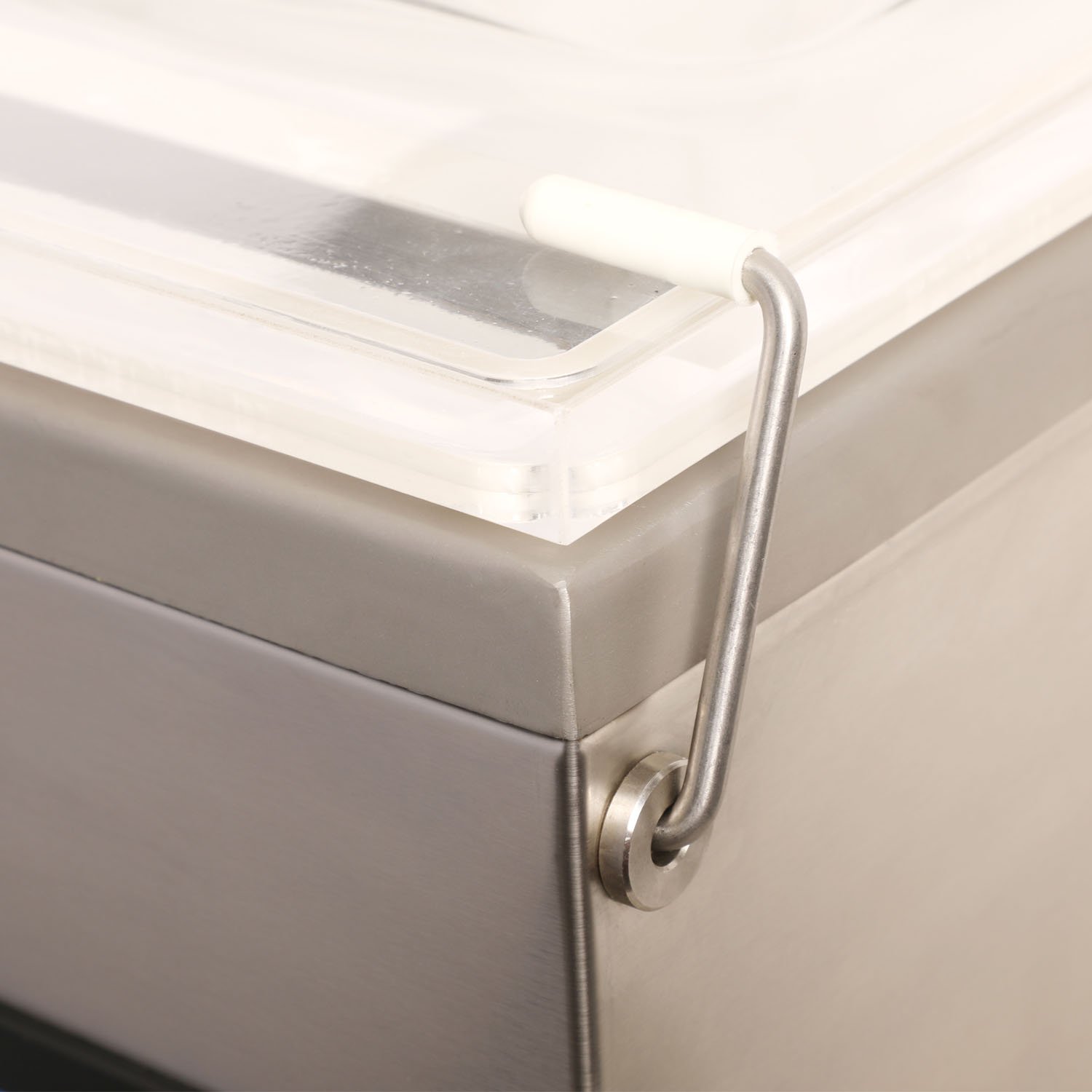 Barra de sellado de 280 mm, cámara de acero inoxidable, tapa transparente y diseño compacto.